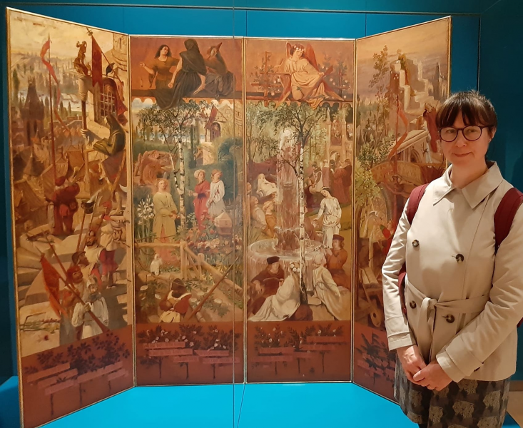 The screen was sold after Leathart’s death and exhibited only once during the twentieth century. But it has recently been the focus of a major conservation project and is now a highlight of the Scottish collection of the National Galleries of Scotland. In this lecture, Emily will share her research into the screen and the associated King’s Quair mural, explaining their complex imagery and symbolism. She will discuss them in relation to the decorations at Red House – the home of William and Jane Morris – and identify the intriguing Pre-Raphaelite portraits that are hidden within.