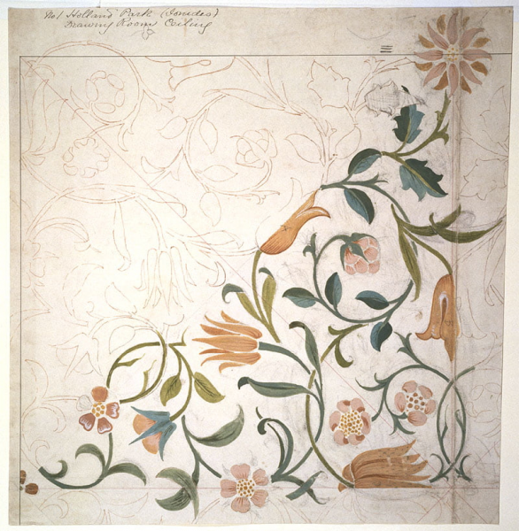 1 Holland Park was the London home of wealthy Greek merchant Alexander Constantine Ionides, and then his youngest son Alexander (Alecco), a family at the centre of the artistic and literary elite of the day. It was the beautiful interior, commissioned from Morris & Company, and other leading figures of the Arts and Crafts Movement, that was of major significance, providing an invaluable record of domestic decoration in the late nineteenth century. From wallpaper and carpets to curtains and chairs, Morris & Company decorated the major rooms of this stunning London residence. This resulted in the Ionides family home becoming the subject of articles and photographic reports, and it is no surprise that the property was known as a ‘showcase of the decorative arts’. There is also a substantial surviving record of correspondence between customer and client, leaving a fascinating record of a Morris & Company commission. However, a lesser-known aspect of this scheme is the delightful Morris & Company ceiling design for the drawing room. The William Morris Society is fortunate to have the original watercolour for this ceiling in its collection, providing a unique insight into the colouring and feel of the interior, now that the house is no longer extant.